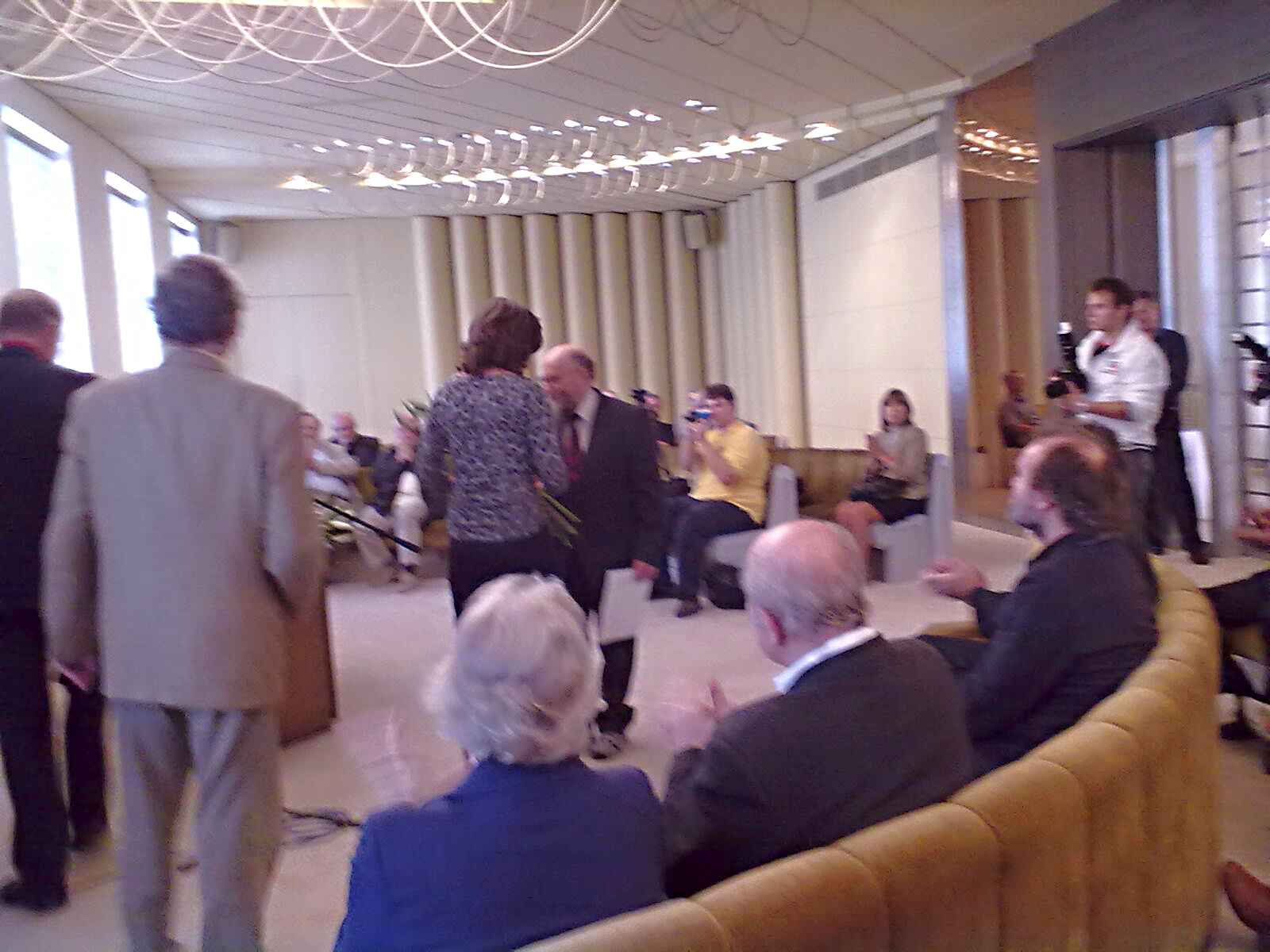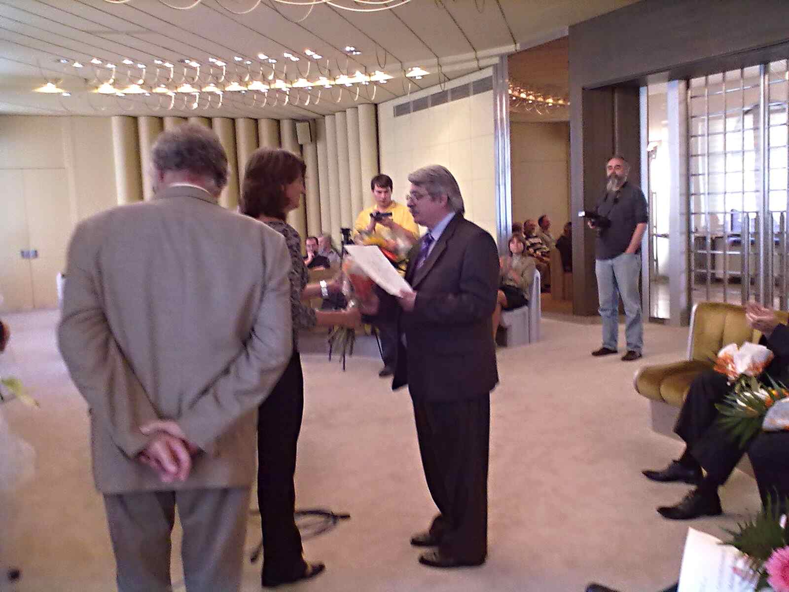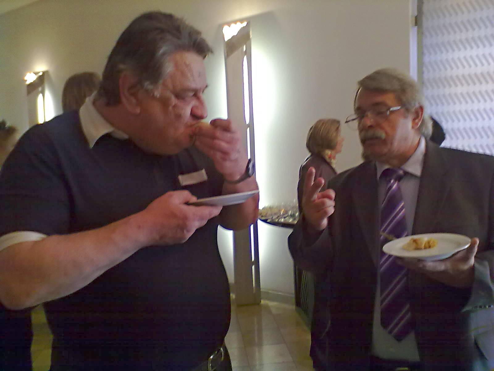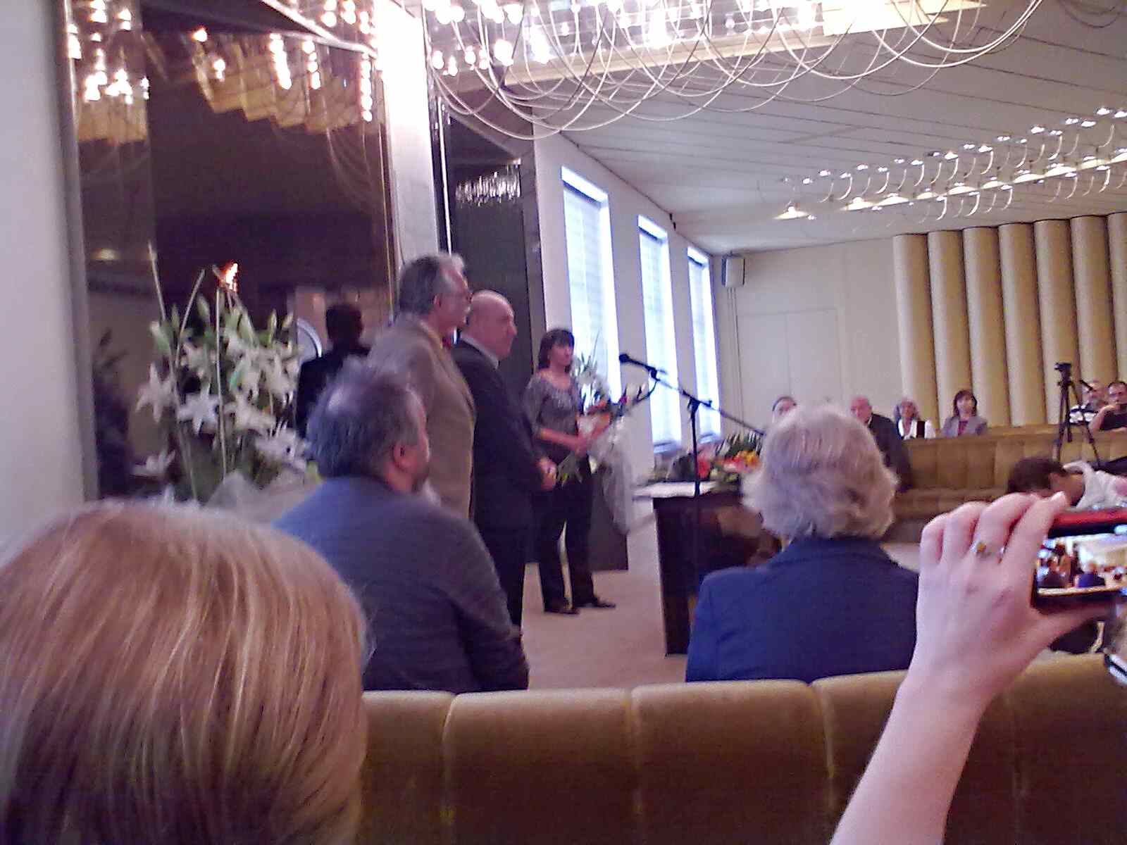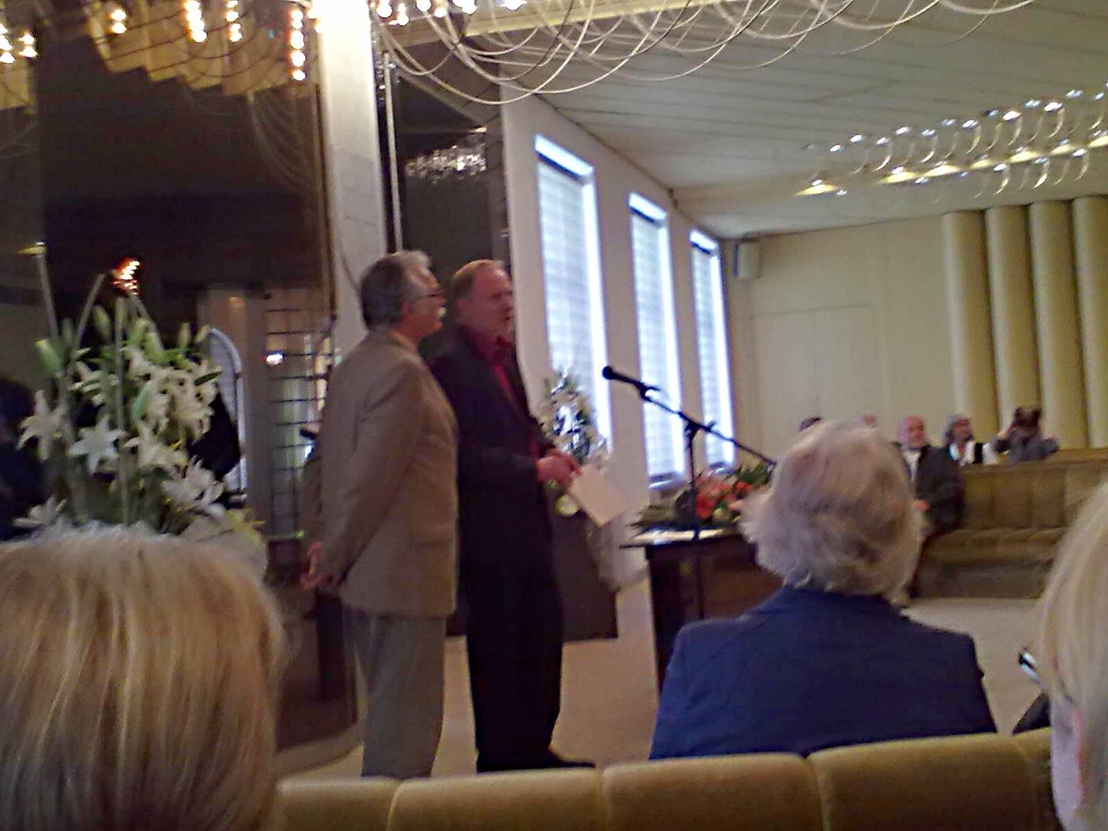 Po odovzdaní všetkých ocenení a gratuláciách sa prítomným prihovoril okrem predsedu rady prof. Bokesa aj súčasný riaditeľ hudobného fondu Mgr. Matúš Jakabčic, ktorý vyzdvihol najmä tú skutočnosť, že hudobný fond v súčasnosti ako jediný udeľuje každoročne ceny aj s finančným ohodnotením celkom v 6 žánroch hudby a interpretačného umenia a vyjadril nádej, že to aj pri stále nových a nových zmenách i zásahoch do poslania fondov tento trend zostane zachovaný pre podporu slovenskej hudobnej tvorby a interpretačného umenia. Potom vyzval zúčastnených k malému občerstveniu a ku gratuláciám a osobným rozhovorom s ocenenými a aj k ich spoločnej fotografii. My sme zostali s Milom ešte pár vzácnych chvíľ v rozhovore a podnetných nápadoch a potom sme sa rozišli každý po svojich povinnostiach.