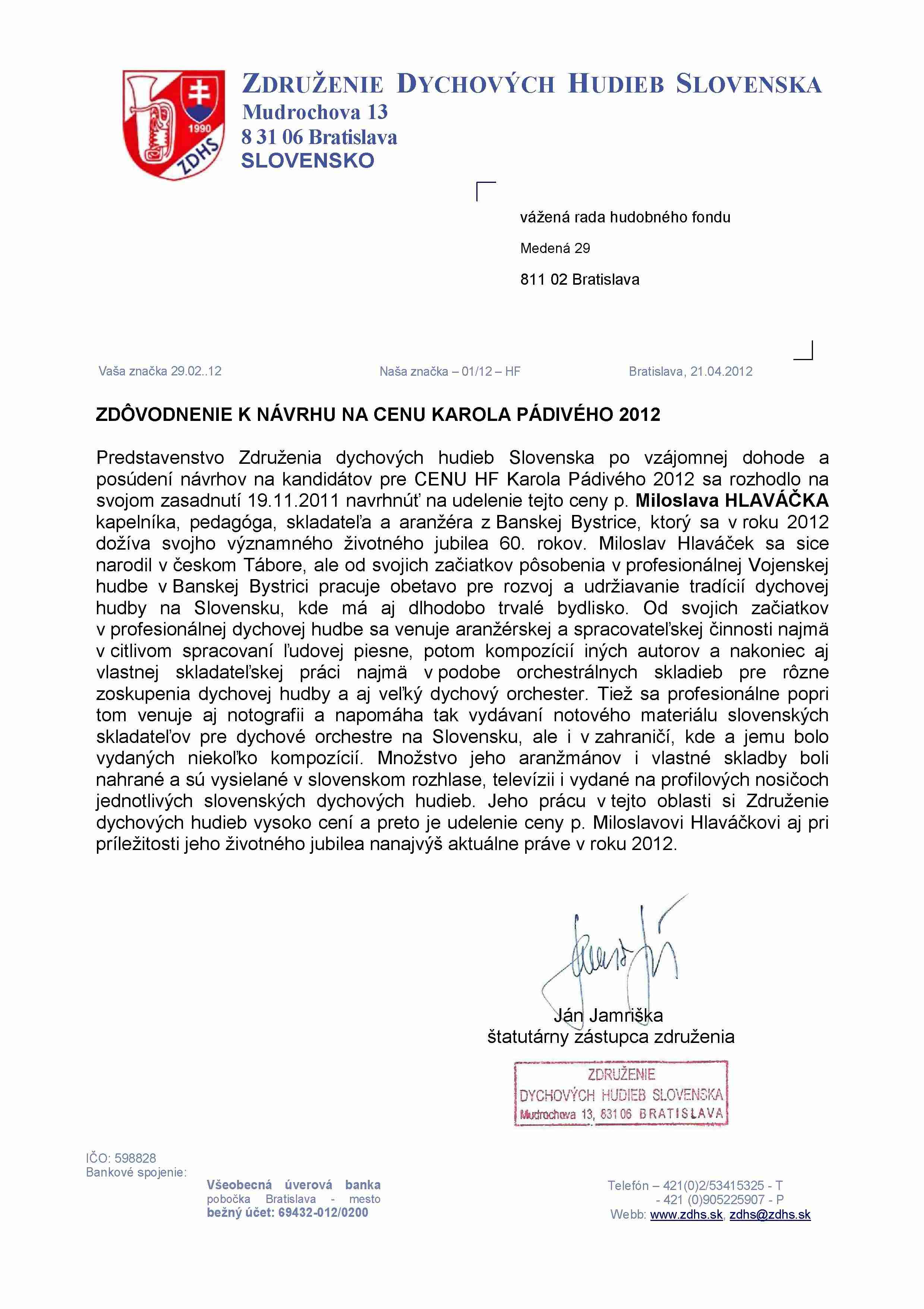 Na záver chcem vyjadriť za celé predstavenstvo ZDHS úprimnú gratuláciu k udelenej cene Karola Pádivého Miloslavovi Hlaváčkovi za jeho skutočne kus vykonanej práce pre dychovú hudbu na Slovensku a jej stály rozvoj. GRATULUJEME!!! (jaja)