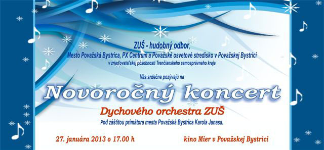 Dychový orchester ZUŠ PB srdečne pozýva všetkých priateľov a priaznivcov na tradičný Novoročný koncert, ktorý sa uskutoční v nedeľu 27. januára 2013 v Považskobystrickom kine Mier.