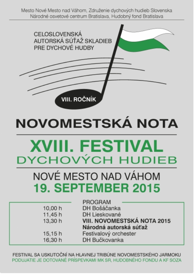 Dňa 19. 9. 2015 sa na hlavnej tribúne Novomestského jarmoku uskutočnil 18. ročník festivalu dychových hudieb s názvom Novomestská nota. Festival je už 8. rok spojený s celoslovenskou autorskou súťažou skladieb pre dychové hudby. Organizátormi podujatia boli: Združenie skladateľov dychovej hudby, Mesto Nové Mesto nad Váhom, Združenie dychových hudieb Slovenska, Národné osvetové centrum Bratislava a Hudobný fond Bratislava.