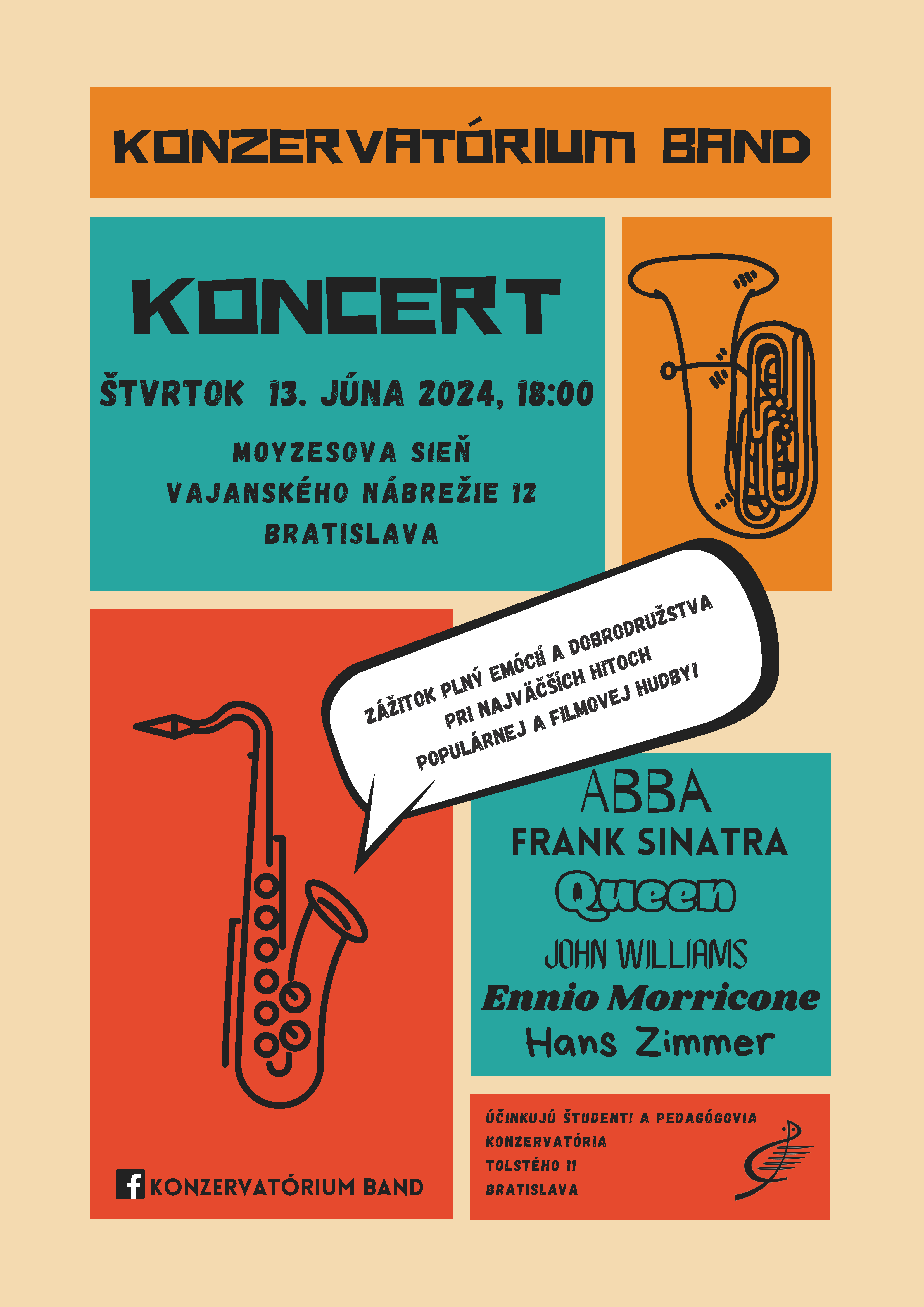 Konzervatórium Band Bratislava pozýva na koncert populárnej a filmovej hudby dňa 13.6.2024 od 18:00hod.