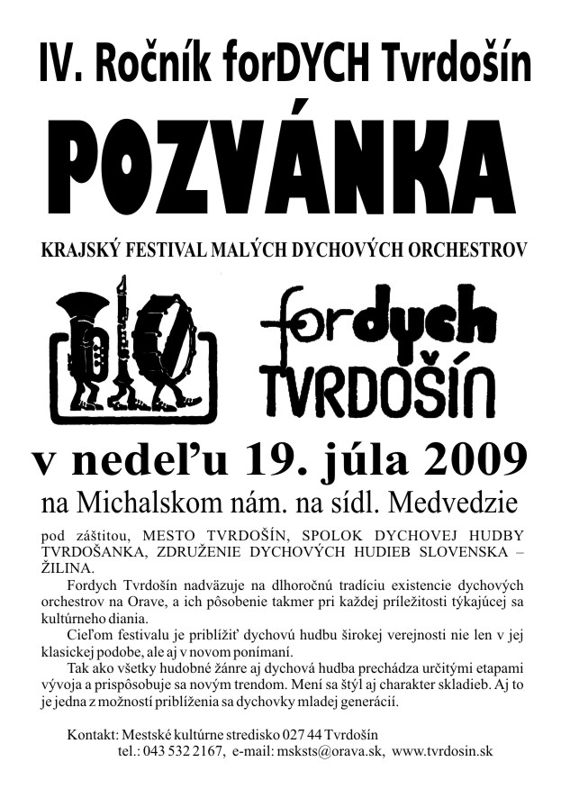 Pozvánka a program festivalu dychových hudieb FORDYCH 2009 TVRDOŠÍN.