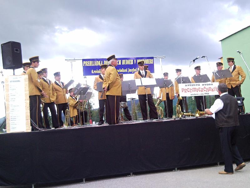 Je poobedie 6. septembra 2009 a prichádzam spoločne s dychovou hudbou Lieskovankou na avizovanú prehliadku dychových hudieb do Predmiera. Počasie sa zdá byť stabilné a tak sa akcia koná na priestranstve pred športovou halou, ktorá bola pripravená na mokrý variant. Predmierčanka, ktorá je hlavným organizátorom tohto podujatia je pripravená vystúpiť ako prvá a to vo svojich známych uniformách, ktoré získali dávnejšie prostredníctvom Paula a Marty van Ooijen zo Švajčiarska. V súčasnosti sa chystajú odviezť si ďalšiu sadu novších uniforiem, ktoré sú už skoro kompletne pripravené pre nich, ako sme písali dávnejšie. Premyslene pripravená akcia, je venovaná dlhoročnému kapelníkovi, a hráčovi pánu Jozefovi Bajzovi, obetavému človeku, ktorý má najväčšie zásluhy, že dychová hudba v Predmieri existuje dodnes a stále sa rozvíja. Prehliadku teda zahajuje Predmierčanka, ktorá predvádza svoj naštudovaný repertoár. Po nej vystúpi Dh Hoľazňanka z Plevníka, ktorá svoj názov odvodila podľa neďalekého vrchu Hoľazne a záver pred spoločným vystúpením obstarala DH Lieskovanka z Horného Lieskova, ktorá sa v tomto roku zúčastnila aj celoštátnej súťažnej prehliadky v Lednických Rovniach a získala zlaté pásmo. obecenstvo je s výkonmi jednotlivých účastníkov spokojné a dáva to patrične najavo aj svojim potleskom. Po záverečných spoločne zahraných pochodoch, po krátkej prestávke hrá samozrejme ešte domáca Predmierčanka do tanca i na počúvanie. Podujatie sa vydarilo a bude mať v budúcnosti pokračovanie, ako mi vravia obaja Bajzovci - otec so synom, ktorý vlastne spoločne s kapelou všetko zabezpečovali aj s pomocou slušnej riadky sponzorov, ktorí pomohli úrovni podujatia. Bol som rád, že som mohol byť pri štarte nového podujatia, ktoré sa chystá mať pokračovanie a tým aj rozšíri počet podujatí s dychovou hudbou na Slovensku, ktoré sú veľmi potrebné pre propagáciu a udržanie tradícií tohto žánra. Poďakovanie patrí všetkým zúčastneným, ale najmä Predmierčanke, ktorá sa bude určite dlhé roky tešiť, že bola iniciátorom takéhoto festivalu dychovej hudby vo svojej obci, ktoré bude aj zviditeľnením jej práce pre dychovú hudbu na Slovensku. Vďaka a tešíme sa o rok na pokračovanie a peknú nedeľu. (Ján Jamriška - ZDHS)
