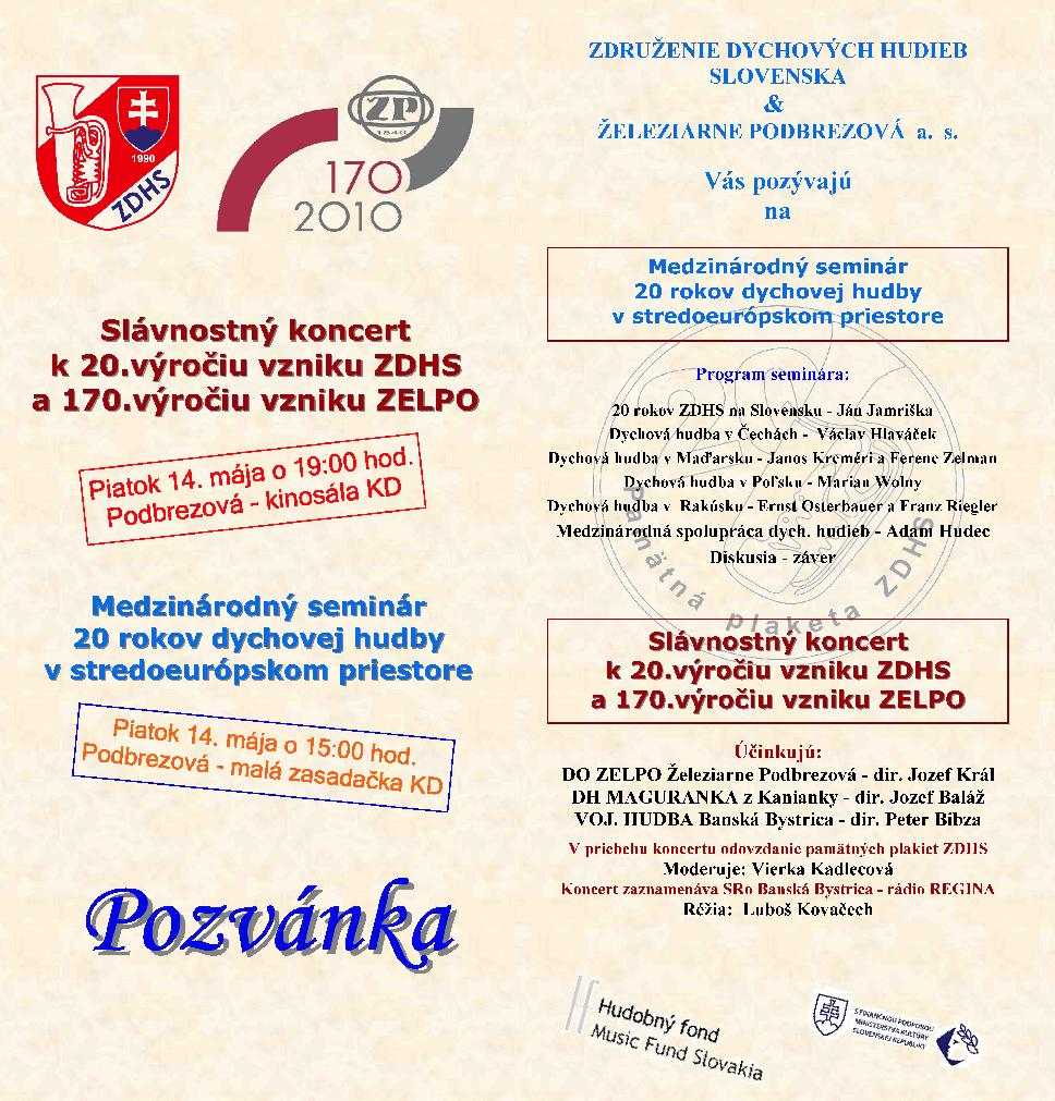 Predkladáme Vám Pozvánku s programom na akcie 14.5.2010, teda prvého dňa podujatí ZDHS a to medzinárodný seminár a slávnostný koncert s pripomienkou 20. výročia vzniku ZDHS a 170. výročia vzniku ZEPO a.s.