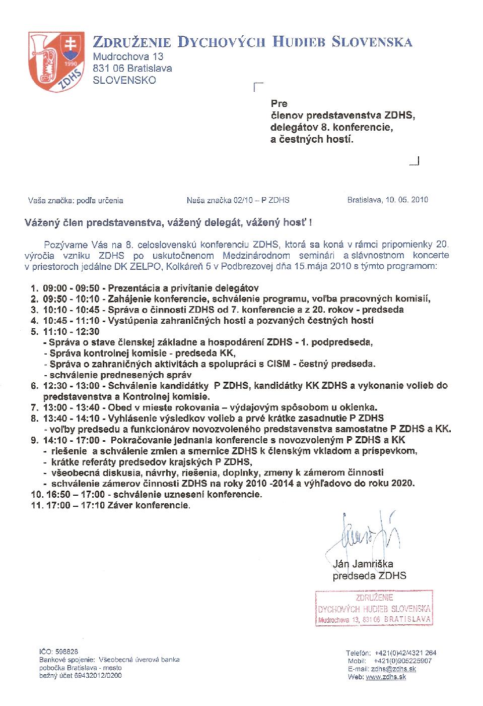 8. konferencia odsúhlasila a schválila ďakovný list SRo a jeho riaditeľke za pochopenie vo vysielaní dychovej hudby vo verejnoprávnych médiách. List bude v plnom znení zverejnený na stiahnutie v tejto časti, spolu s ostatnými dokumentmi. 8. konferencia dala za úlohu dopracovať a schváliť nové zámery činnosti po diskusii a ankete na webovej stránke a zreálnení podkladov novozvolenému predstavenstvu ZDHS, najneskôr na jesennom zasadnutí predstavenstva ZDHS dokedy sú stále v platnosti zámery činnosti ešte od 7. konferencie. Konferencia bola ukončená 15.5.2010 v Podbrezovej a materiály sa postupne spracovávajú za konzultácie užšieho predstavenstva ZDHS a kontrolnej komisie. (Ján Jamriška - predseda)