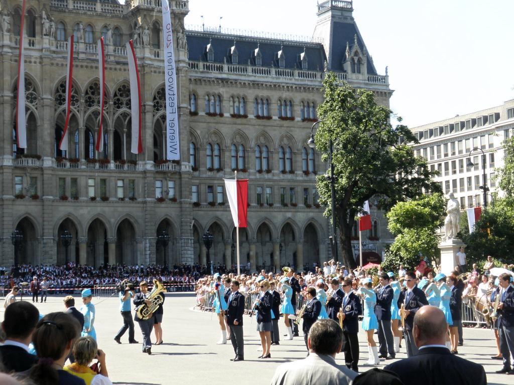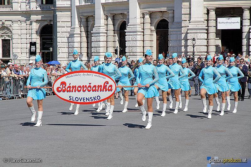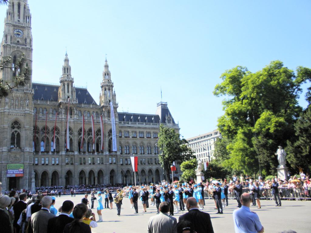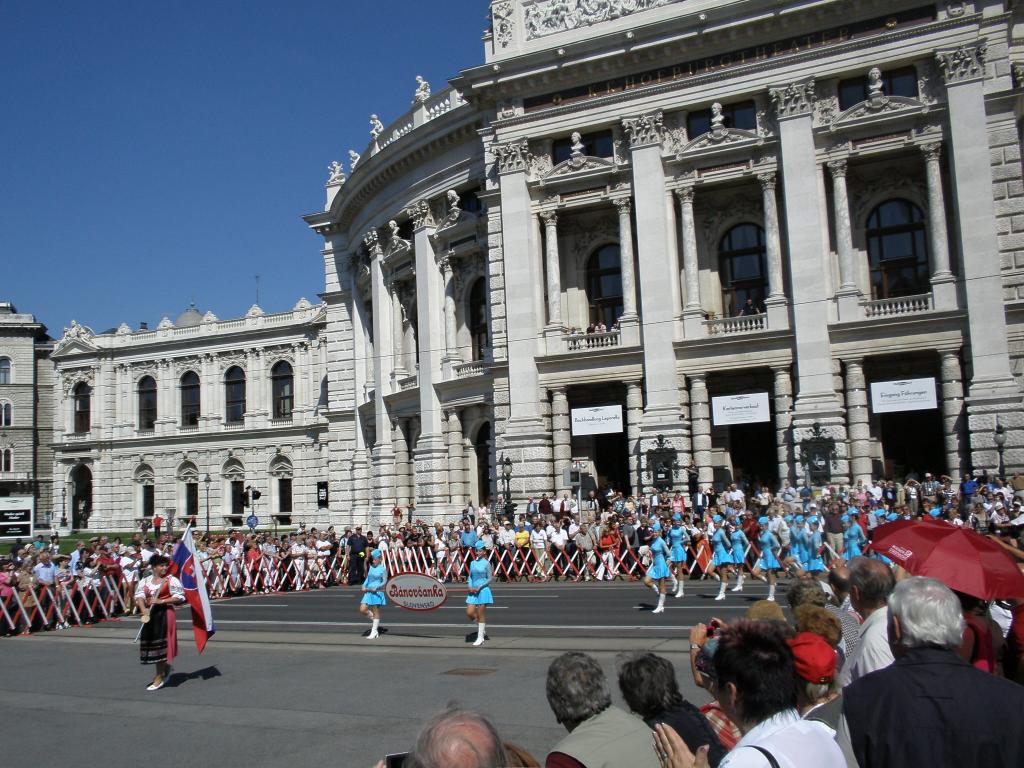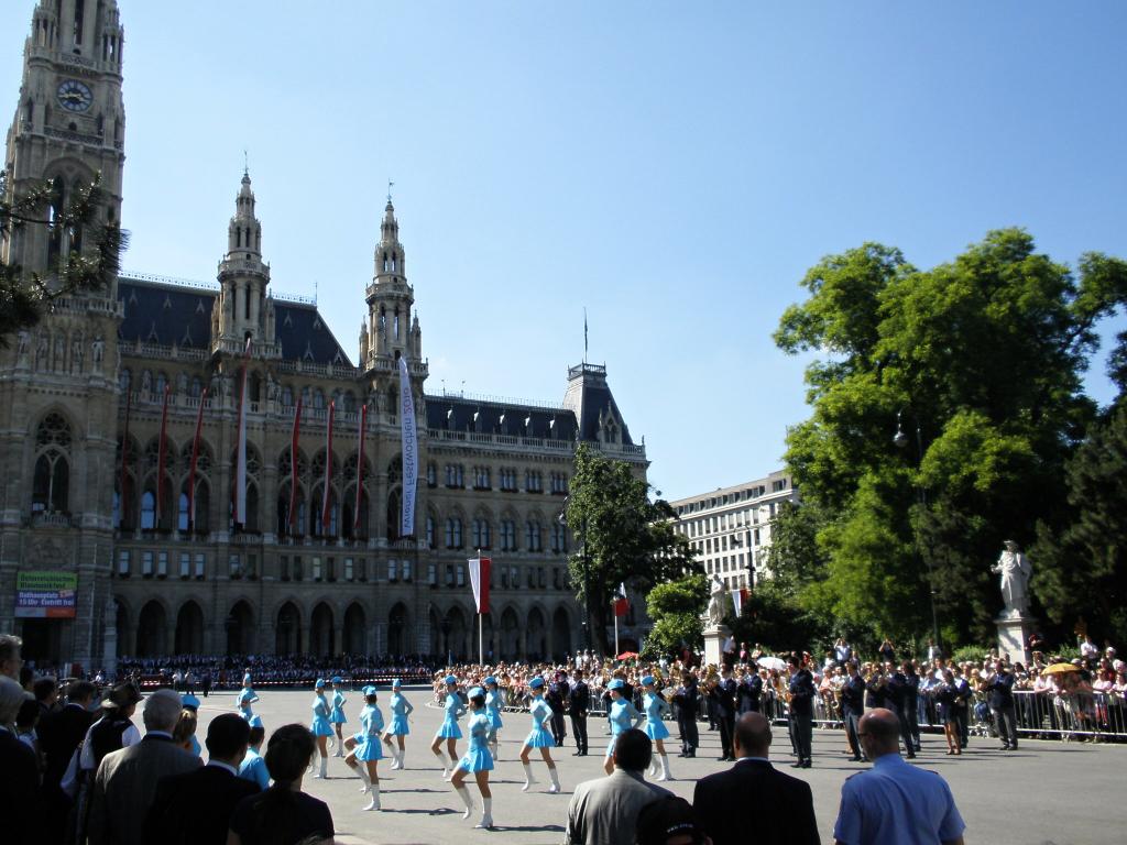 Popoludní program pokračoval na Námestí Hrdinov (Heldenplatz). Tu sa konala opäť zhrávka na spoločný koncert. A potom to začalo. Odtiaľto vypochodovali všetky kapely smerom k radnici. Ulice lemované stovkami divákov podporovali všetkých muzikantov a dodávali im silu pochodovať v tridsať stupňovej horúčave. Ako prvé vyšli do ulíc Viedne rakúske súbory reprezentujúce každá svoj kraj (Südtirol, Burgenland, Kärnten, Niederösterreich, Oberösterreich, Salzburg, Steiermark, Tirol, Vorarlberg, Wien). Každá z týchto kapiel bola tvorená zoskupením troch súborov, teda veľký počet muzikantov a ešte väčší zvuk. Následne nastupovali kapely z Nemecka a Lichtenštajnska. A potom nasledovali baby z Tiny a za nimi my. Pochod mažoretiek na piesne hrané Bánovčankou rozveselil pohľad každého prítomného v publiku a potlesk bol z kroku na krok silnejší. A tak sme sa blížili k radnici a k pódiu, na ktorom boli prítomní všetci čelní predstavitelia mesta Viedeň, a ktorých sme mali ako jediný pobaviť akýmsi šouprogramom, nakoľko všetky predošlé kapely iba prešli okolo nich a ukázali svoje umenie v pochodovaní. Priebeh tohto nášho vystúpenia skrsol v hlave pána Adama Hudeca, ktorý sem Bánovčanku i Tinu dostal. V Devínskej Novej Vsi sa jednu peknú aprílovú nedeľu nacvičil a teraz 5.6.2010 bol ten správny čas ukázať všetkým, čo sme nacvičili a byť ešte lepší ako na skúške. „Šou“ začala tancom mažoretiek na Pádivého Slovenský pochod. Celé osadenstvo tribúny išlo oči nechať na pekných slovenských devách. Následne skladba prešla do Virtuóznej polky a sólista na klarinete začal svojou hrou „baliť“ hlavnú mažoretku, tá nie a nie sa mu oddať a v tom prišiel na rad ďalší záujemca o túto krásavičku a to sólista na tube v Ondrej polke. Akési hudobné prekáračky dvoch súperov si všimla „mama“ a tá chlapcov rozohnala čo najďalej od svojej dcérušky. A to už nasledoval Slovanský pochod a dotancovanie choreografie mažoretkami a následne obrovský potlesk, smiech a nadšené tváre tribúny a prítomných a cvakanie fotoaparátov. Za búrlivého potlesku sme pokračovali ďalej k radnici na Rathausplatz a čakali na záverečný koncert, nakoľko za nami ešte pochodovala kapela z Maďarska a domáca Gardemusik Wien (posádková hudba).