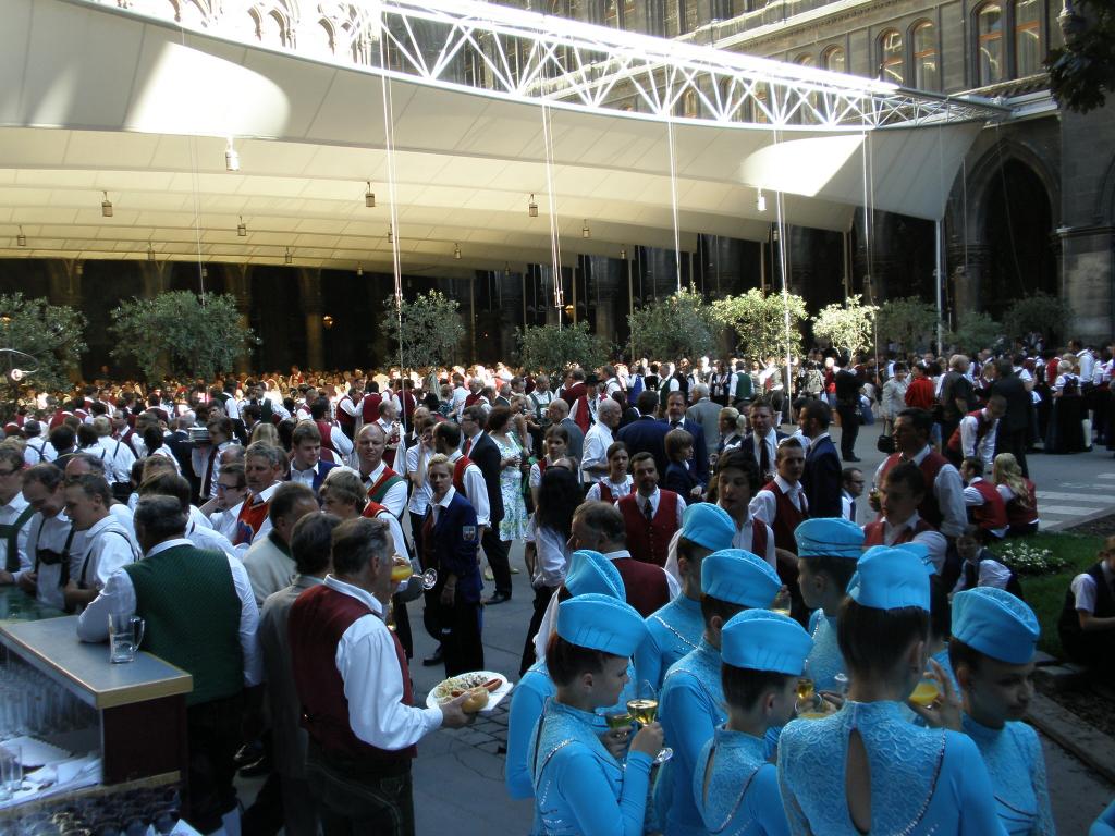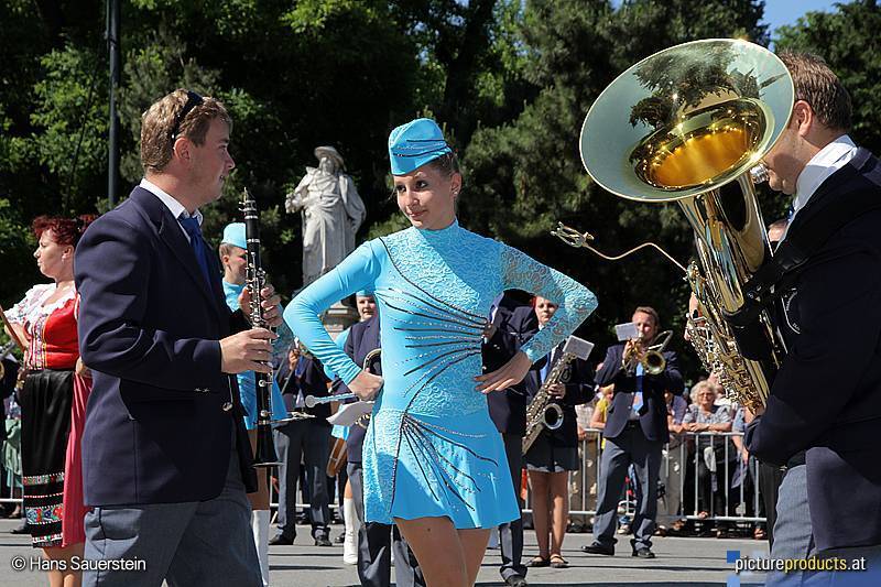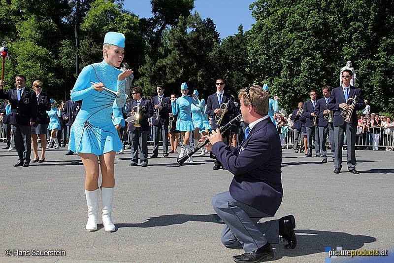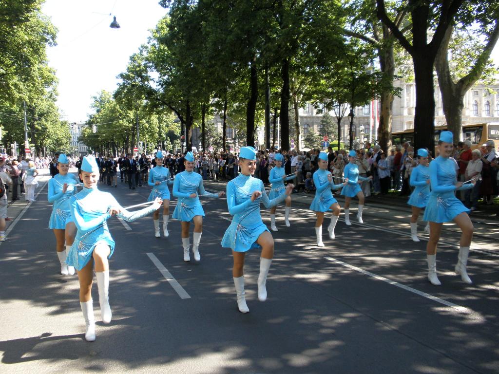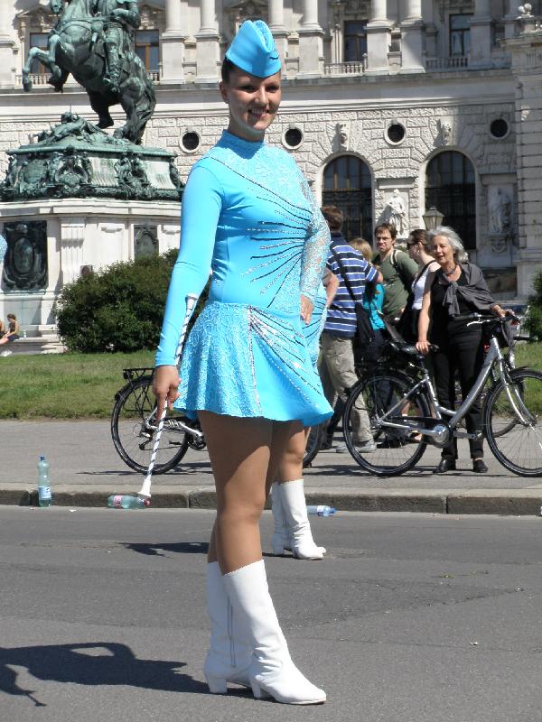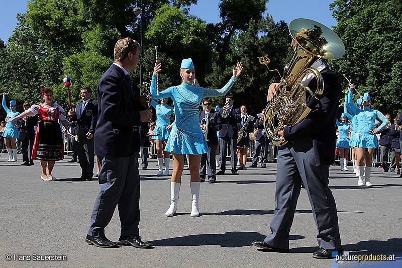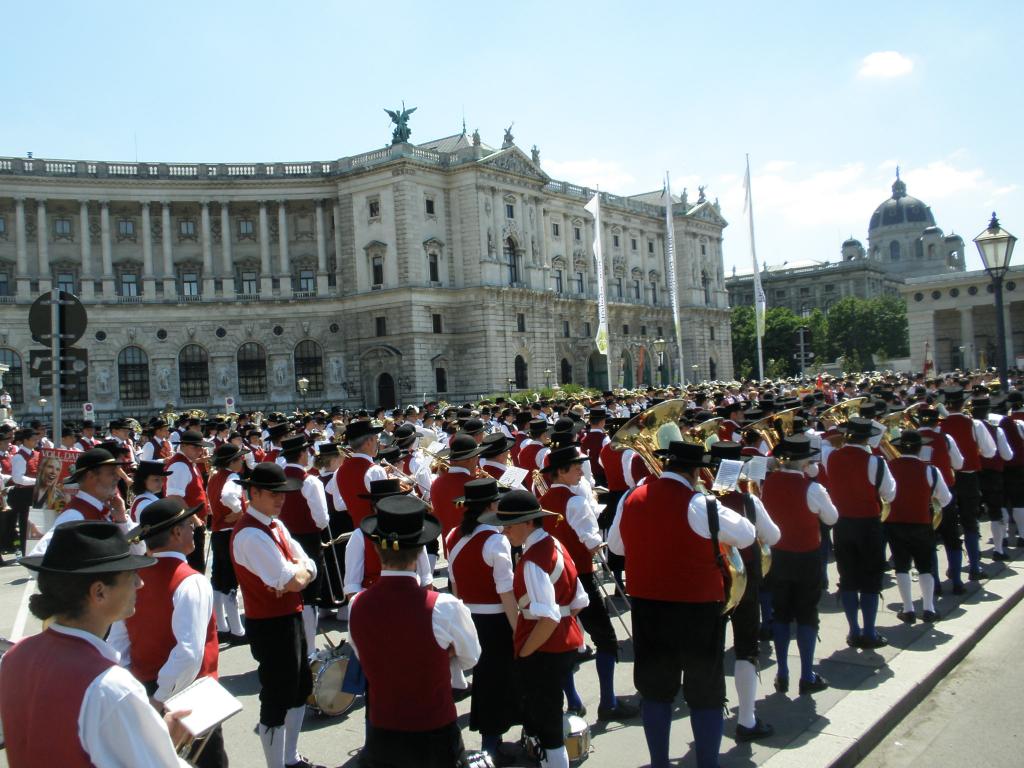 Popoludní program pokračoval na Námestí Hrdinov (Heldenplatz). Tu sa konala opäť zhrávka na spoločný koncert. A potom to začalo. Odtiaľto vypochodovali všetky kapely smerom k radnici. Ulice lemované stovkami divákov podporovali všetkých muzikantov a dodávali im silu pochodovať v tridsať stupňovej horúčave. Ako prvé vyšli do ulíc Viedne rakúske súbory reprezentujúce každá svoj kraj (Südtirol, Burgenland, Kärnten, Niederösterreich, Oberösterreich, Salzburg, Steiermark, Tirol, Vorarlberg, Wien). Každá z týchto kapiel bola tvorená zoskupením troch súborov, teda veľký počet muzikantov a ešte väčší zvuk. Následne nastupovali kapely z Nemecka a Lichtenštajnska. A potom nasledovali baby z Tiny a za nimi my. Pochod mažoretiek na piesne hrané Bánovčankou rozveselil pohľad každého prítomného v publiku a potlesk bol z kroku na krok silnejší. A tak sme sa blížili k radnici a k pódiu, na ktorom boli prítomní všetci čelní predstavitelia mesta Viedeň, a ktorých sme mali ako jediný pobaviť akýmsi šouprogramom, nakoľko všetky predošlé kapely iba prešli okolo nich a ukázali svoje umenie v pochodovaní. Priebeh tohto nášho vystúpenia skrsol v hlave pána Adama Hudeca, ktorý sem Bánovčanku i Tinu dostal. V Devínskej Novej Vsi sa jednu peknú aprílovú nedeľu nacvičil a teraz 5.6.2010 bol ten správny čas ukázať všetkým, čo sme nacvičili a byť ešte lepší ako na skúške. „Šou“ začala tancom mažoretiek na Pádivého Slovenský pochod. Celé osadenstvo tribúny išlo oči nechať na pekných slovenských devách. Následne skladba prešla do Virtuóznej polky a sólista na klarinete začal svojou hrou „baliť“ hlavnú mažoretku, tá nie a nie sa mu oddať a v tom prišiel na rad ďalší záujemca o túto krásavičku a to sólista na tube v Ondrej polke. Akési hudobné prekáračky dvoch súperov si všimla „mama“ a tá chlapcov rozohnala čo najďalej od svojej dcérušky. A to už nasledoval Slovanský pochod a dotancovanie choreografie mažoretkami a následne obrovský potlesk, smiech a nadšené tváre tribúny a prítomných a cvakanie fotoaparátov. Za búrlivého potlesku sme pokračovali ďalej k radnici na Rathausplatz a čakali na záverečný koncert, nakoľko za nami ešte pochodovala kapela z Maďarska a domáca Gardemusik Wien (posádková hudba).