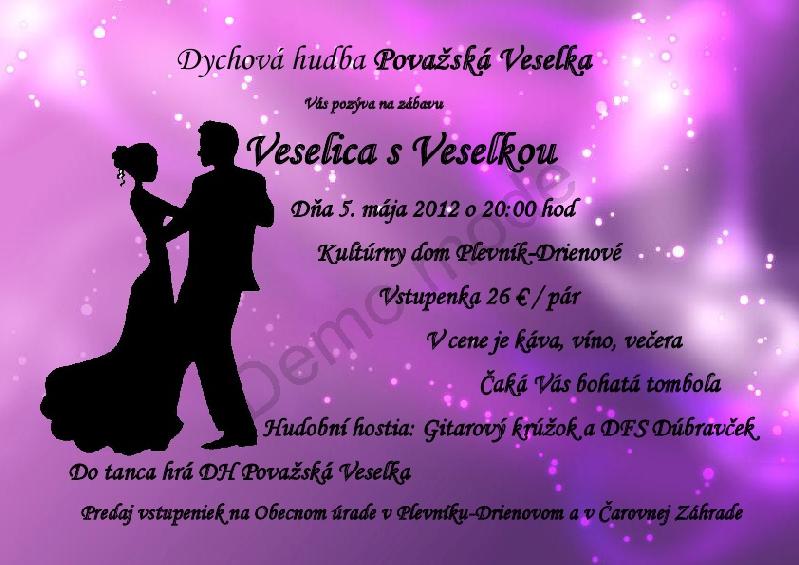 Zábava sa uskutoční 5. mája 2012 o 20:00 hod v Kultúrnom dome Plevník - Drienové. Viac info na plagáte: