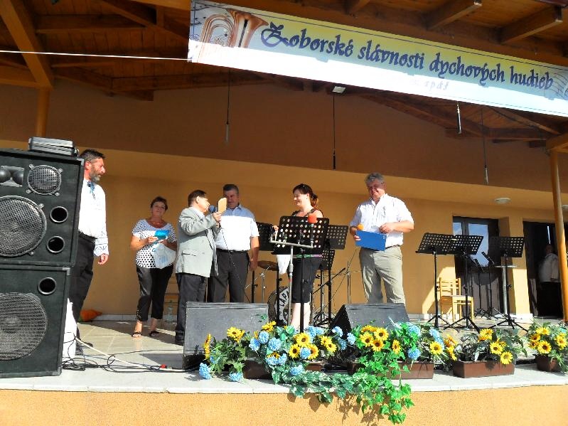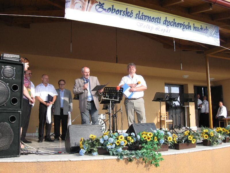V priebehu vystúpenia Lapášanky nastal aj čas na odovzdanie ocenení, pre ktoré sme sem okrem iného prišli. Za Združenie dychových hudieb Slovenska odovzdávam ocenenie v podobe pamätných plakiet k 20. výročiu vzniku ZDHS a to p. Márii Gughovej za dlhoročnú úspešnú spoluprácu a podporu dychovej hudby Lapášanka, p. Michalovi Vindišovi pri príležitosti jeho jubilejnej 50-tky za dlhoročnú obetavú prácu pre dychovú hudbu Zálužanka, p. Miroslavovi Polčíkovi – za dlhoročnú obetavú prácu pre ZDHS Nitrianskeho kraja, ZOBORSKÉ SLÁVNOSTI a DH Lapášanku. No a nakoniec Kataríne Neveďalovej – našej mladej europoslankyni za obetavý osobný záujem o rozvoj tradícií a podporu dychovej hudby na Slovensku. Okrem plakety si všetci ocenení odnášajú aj knihu „To bola Malokarpatská kapela„ autora Adama Hudeca aj s osobným venovaním. Po oceneniach ZDHS prichádza riaditeľ sekcie osvetovej činnosti Národného osvetového centra p. Jozef Burič, ktorý si aj cez svoju zaneprázdnenosť účasťou na celoštátnom podujatí našiel trochu času, aby mohol osobne odovzdať pocty Generálneho riaditeľa NOC dvom osobnostiam dychovej hudby a to p. Ladislavovi Dudovi z DH Lapášanka za úspešné rozvíjanie tradície dychovej hudby v obci Veľký Lapáš a dlhoročnú príkladnú reprezentáciu doma i v zahraničí a p. Dušanovi Palackovi – pedagógovi a dirigentovi za zanietené rozvíjanie tradície dychovej hudby v Nitrianskom kraji, dlhoročnú výchovu mladej generácie a príkladnú reprezentáciu doma i v zahraničí. Všetkým odmeneným aj touto cestou chceme popriať veľa zdravia a ďalších osobných úspechov a spoločenského uznania ich práce pre dychovú hudbu na Slovensku.