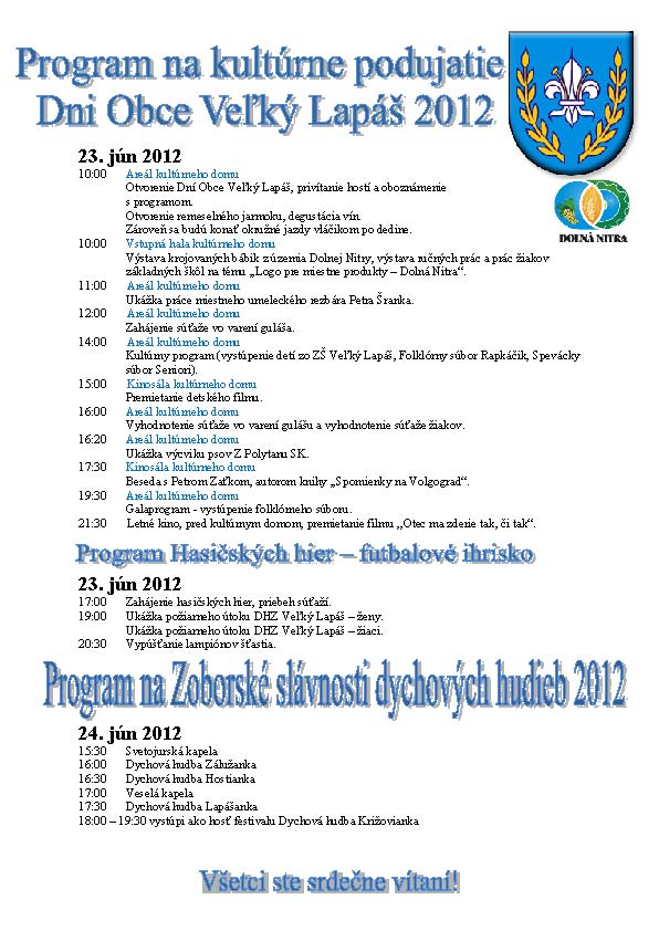 Je pekná svätojánska nedeľa a my sme sa vydali za plného obsadenia auta z Považskej Bystrice za kultúrou k našim priateľom do Nitrianskeho kraja. V aute sa nachádzajú samí mladí ľudia iba ja sa už blížim k mládežníckym rokom z tej druhej strany a hlavne v spomienkach na predchádzajúce roky tohto podujatia. Festival Zoborské slávnosti, ktorý má vo Veľkom Lapáši svoju dlhoročnú tradíciu organizuje od jeho začiatkov, krajský predseda ZDHS p. Miroslav Polčík, ako jeho riaditeľ a Dychová hudba Lapášanka, spolu s obcou Veľký Lapáš. Tentoraz sa koná toto podujatie aj so záštitou našej europoslankyne Kataríny Neveďalovej, ktorá má k dychovej hudbe i folklóru srdečný vzťah, berie ich aj ako svoje poslanie a Nitriansky kraj je jej obzvlášť blízky, pretože tu v Čeľadiciach má aj svoje korene. Naša Katka, ako ju zvykneme aj nazývať, podporila svojou účasťou už niekoľko takýchto festivalov v rôznych krajoch Slovenska. Aj keď je najmladšou poslankyňou európskeho parlamentu, svojou obetavosťou a prácou v kultúrnej komisii v Bruseli prispieva k udržiavaniu a rozvoji ľudových a národných tradícií najmä u nás, ale tiež aj v štátoch európskej únie. Tento postoj nás môže ako fanúšikov dychovej hudby a členov ZDHS iba hriať pri srdiečku s pocitom, že sú ešte ľudia, ktorí nezabúdajú na potrebu nášho žánra v živote a najmä pri výchove mladej generácie.
