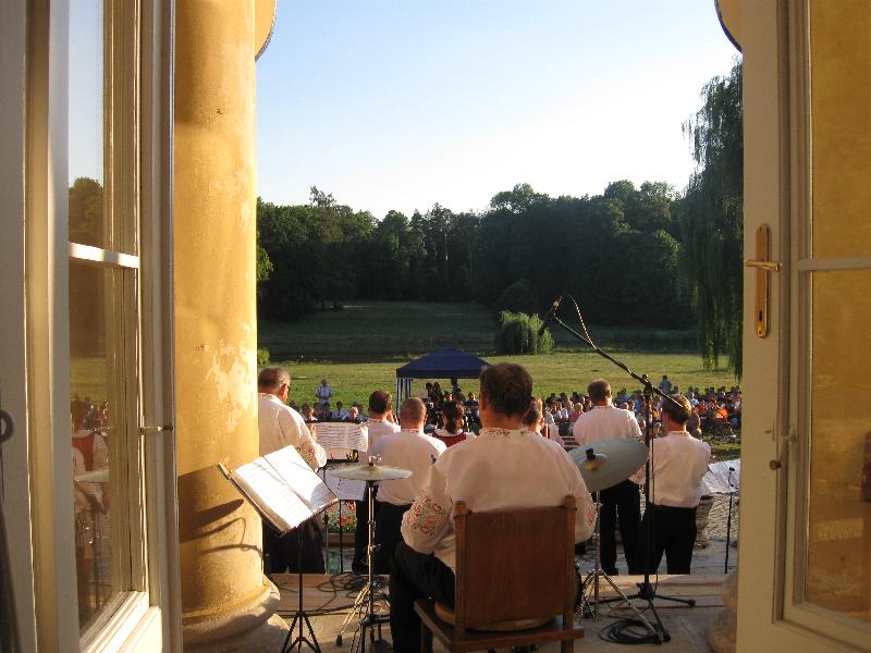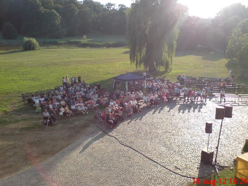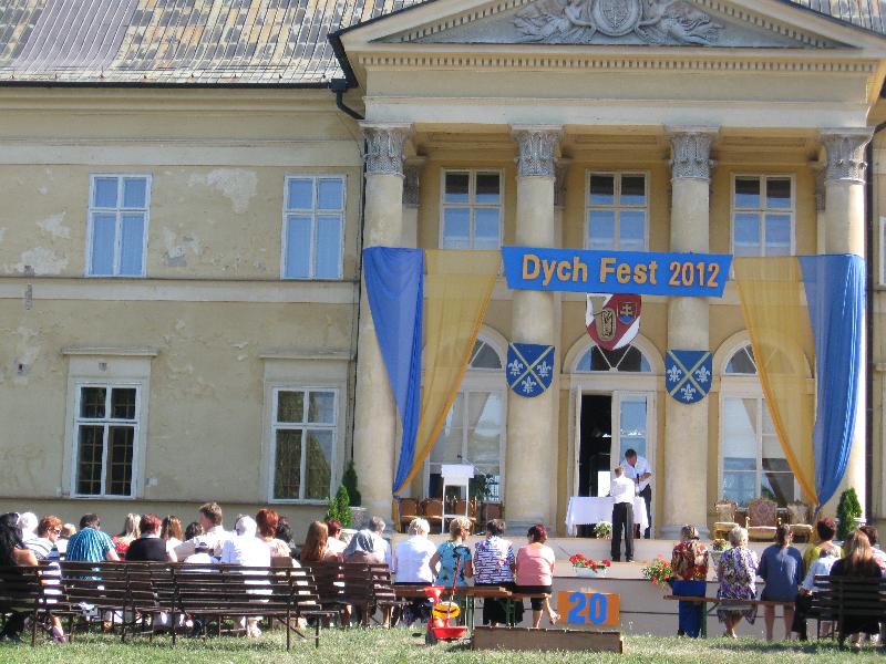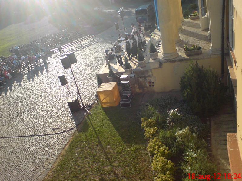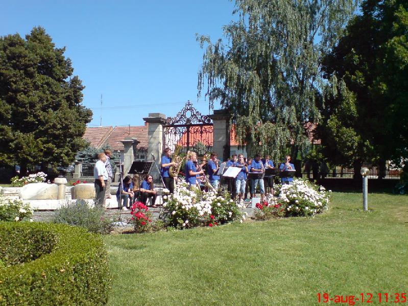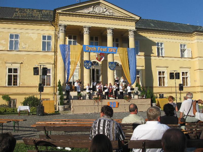 Nedeľa, ako sme už avizovali začala slávnostnou sv. omšou za účasti „DH Dolnokrupanka“spoločne s mladou dolnokrupanskou Karpatskou kapelou. Po sv. omši nasledovali upútavkové koncerty na fontáne pred kaštieľom, ktoré mali ľuďom pripomenúť nedeľné pokračovanie Dychfestu. Na fontáne si zahrala najskôr DH Považská veselka za veľkého obdivu ľudí odchádzajúcich zo sv. omše a potom si spoločne posledný krát zahral Dychový orchester mladých talentov, aby sa po koncerte jeho tohtoročný členovia rozlúčili a rozutekali na všetky strany Slovenska.