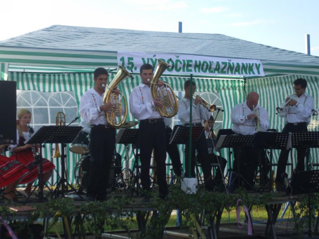 A aká je história Hoľazňanky? „Dychová hudba vznikla v roku 1997. Bola tu dychovka, v ktorej hrávali starší chlapi, medzi nimi aj môj tatko a predtým dedo. Väčšina už nie je medzi nami. Takže nejaké základy som mal. Chcel som, aby sa tradícia udržala. Začal som vyberať od žiakov. Zobral som všetkých a Karol Miškovský mi potom pomohol vybrať tých najlepších. Po prvom výbere ich bolo 32 a potom zostalo 24. Z tých postupom času tiež čosi odpadlo a zostalo nás dvadsať. To sa tiež, samozrejme, rokmi menilo. Niektorí odišli na školy, dievčatá sa povydávali a tak. Tak stabilne nás býva asi trinásť. Aj teraz sa mladí chalani, asi šiesti, osamostatnili a založili si Považskú Veselku,“ hovorí o vývoji dychovej hudby v obci jej kapelník Marián Turčáni.