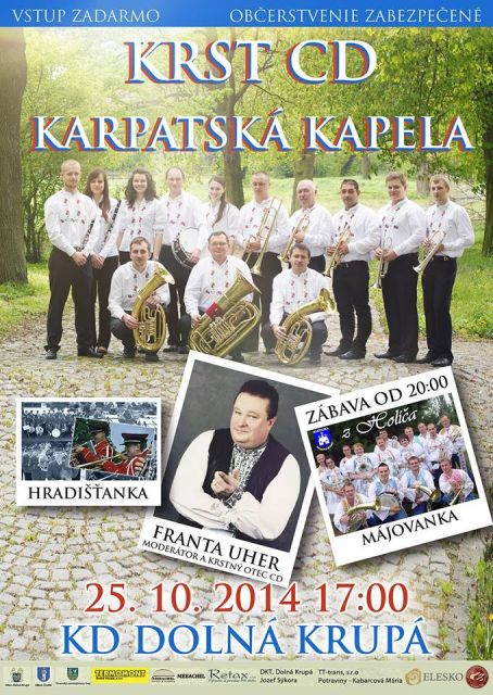 Srdečne pozývame všetkých milovníkov a priateľov dychovej hudby na krst prvého CD DH Karpatská kapela, pod názvom "V tej našej dedinke". Program začína o 17-tej hodine v kultúrnom dome v Dolnej Krupej. Ako prvá sa predstaví DH Hradišťanka,pokračovať bude domáca Karpatská kapela, ktorá po koncerte pokrstí svoje prvé CD. Počas celého programu nebude chýbať sprievodné slovo známeho moderátora, ľudového rozprávača a speváka z Lanžhota - Franta Uher. Do tanca a zábavy bude pripravená DH Májovanka. Už teraz sa na Vás všetkých veľmi tešíme. DH Karpatská kapela.