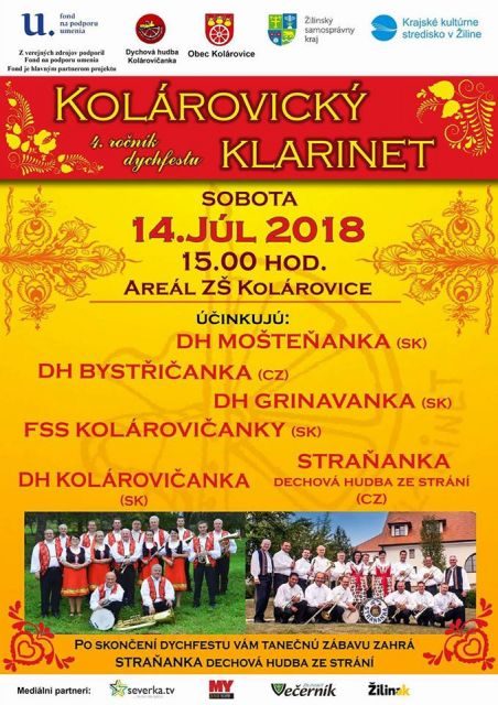4.ročník dychfestu KOLÁROVICKÝ KLARINET - sa uskutoční 14.júla 2018 /sobota/ od 15:00 hod. v areály Základnej školy v Kolároviciach.