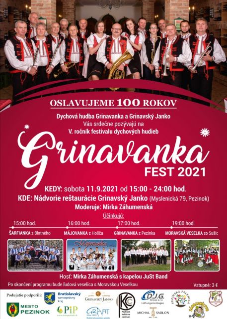Pripravovaný V.ročník festivalu dychových hudieb Grinavanka FEST spojený s oslavami 100.výročia založenia DH Grinavanka sa uskutoční v termíne 11. septembra 2021 od 15,00 do 24,00 hod. v priestoroch nádvoria reštaurácie Grinavský Janko, Myslenická 79 v Pezinku. Svojim programom sa Vám predstavia dychové hudby Šarfianka z Blatného, Májovanka z Holíča, domáca Grinavanka, a zahraničný hosť Moravská Veselka zo Sušíc u Přerova. Sprievodným slovom Vás bude sprevádzať Mirka Záhumenská.