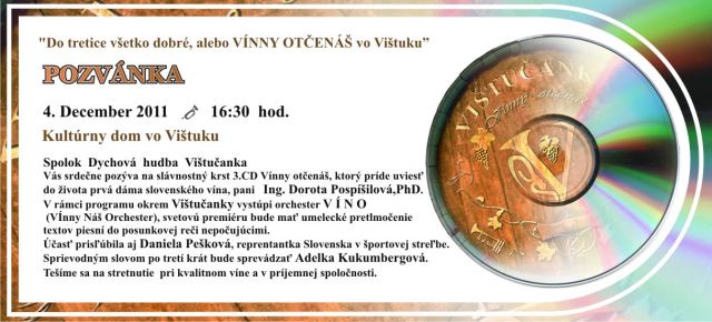 Spolok Dychová hudba Vištučanka vás pozýva na slávnostný krst 3. CD Vínny otčenáš, ktorý príde uviesť do života prvá dáma slovenského vína - pani Ing. Dorota Pospíšilová, PhD.
