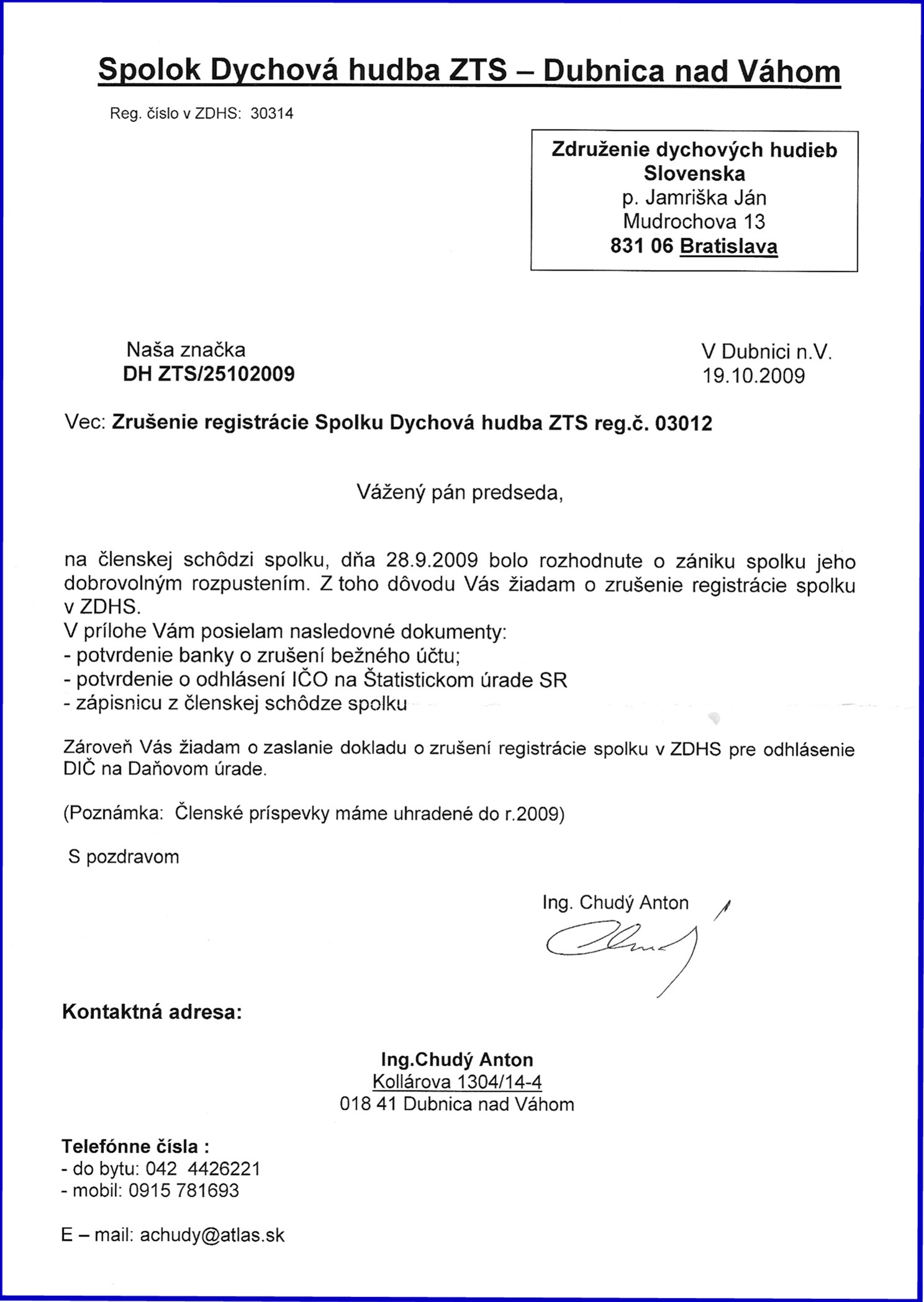 Dňa 19.10.2009 bolo doručené ústrediu ZDHS rozhodnutie spolku Dh ZŤS Dubnica nad Váhom o zániku spolku jeho dobrovoľným rozpustením na základe uznesenia mimoriadnej schôdze spolku dňa 28.9.2009. Súčasne boli dodané aj všetky potrebné dokumenty o zrušení účtu, IČA a hlásenia DÚ a rozhodnutím o majetkovom vysporiadaní. Združenie dychových hudieb Slovenska berie na vedomie rozhodnutie členov v súlade zo stanovami ZDHS a chápe podmienky súčasného stavu spolku, ktoré viedli k tomuto rozhodnutiu. Spolok má všetky svoje povinnosti vôči ZDHS splnené. Ďakujeme spolku za doterajšiu prospešnú činnosť pre dychovú hudbu vo svojom regióne a na Slovensku. (predstavenstvo ZDHS).
